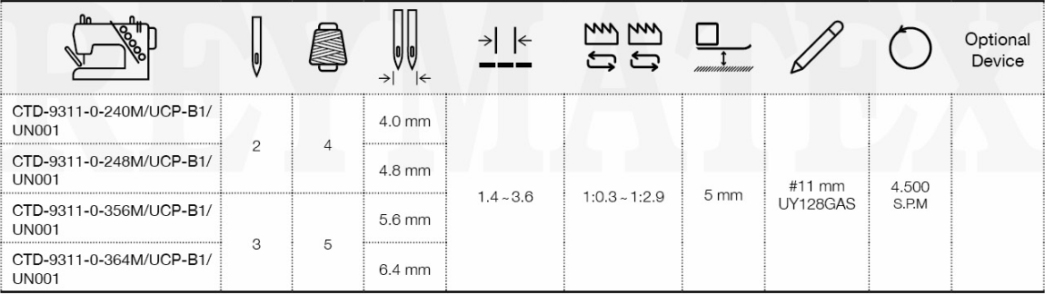 Machine point de recouvrement à entraînement direct (servomoteur Ho Hsing) avec fils de recouvrement supérieur et inférieur, 3 aiguilles. Coupe-tissu côté gauche pour la couture des bas de t-shirts, polos et autres articles similaires. Équipée de coupe-fils supérieur et inférieur pneumatiques automatiques, d'un releveur et d'un guide-pied. Levier releveur extérieur.