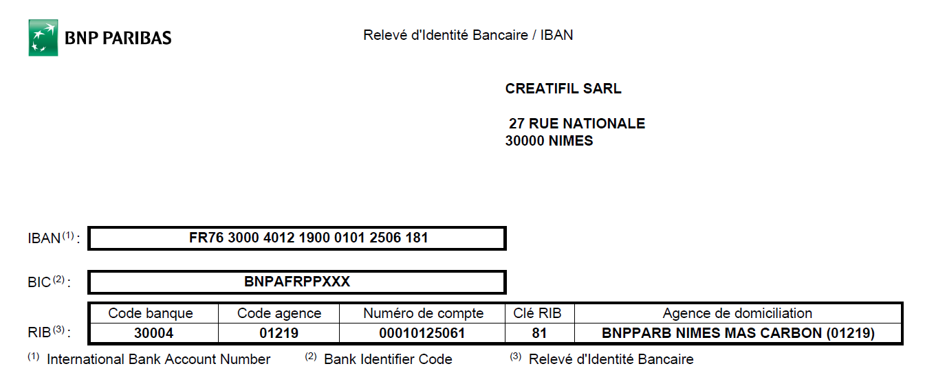 Virement bancaire : Le règlement devra être effectué sur le compte bancaire dont le RIB est ci-dessous.